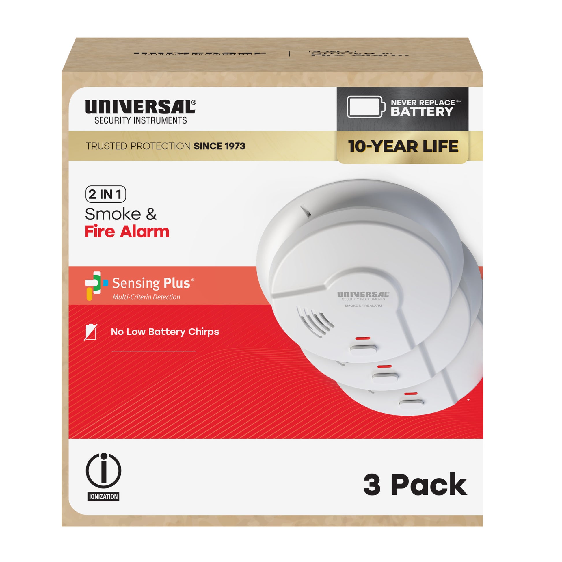 Experience unparalleled protection with the USI Smoke Alarm with 10-Year Battery. Equipped with Sensing Plus Multi-Criteria Detection, this advanced ionization alarm accurately identifies both slow-burning and fast-flaming fires, ensuring early detection and rapid response. It features a 10-Year sealed battery that ensures continuous protection. Replace annoying yearly low-battery chirps with a single end-of-life alert after 10 years to remind you it's time to replace your smoke alarm. Advanced technology reduces nuisance alarms, minimizing disruptions from activities like cooking. Should you experience a false alarm, easily silence it with the test/silence button. With UL certification, you can trust in the reliability and performance of USI Smoke Alarms. Invest in peace of mind and protect your loved ones with this advanced home safety solution. With over 50 years of experience as a leader in home safety, USI provides reliable, long-lasting protection for your home.