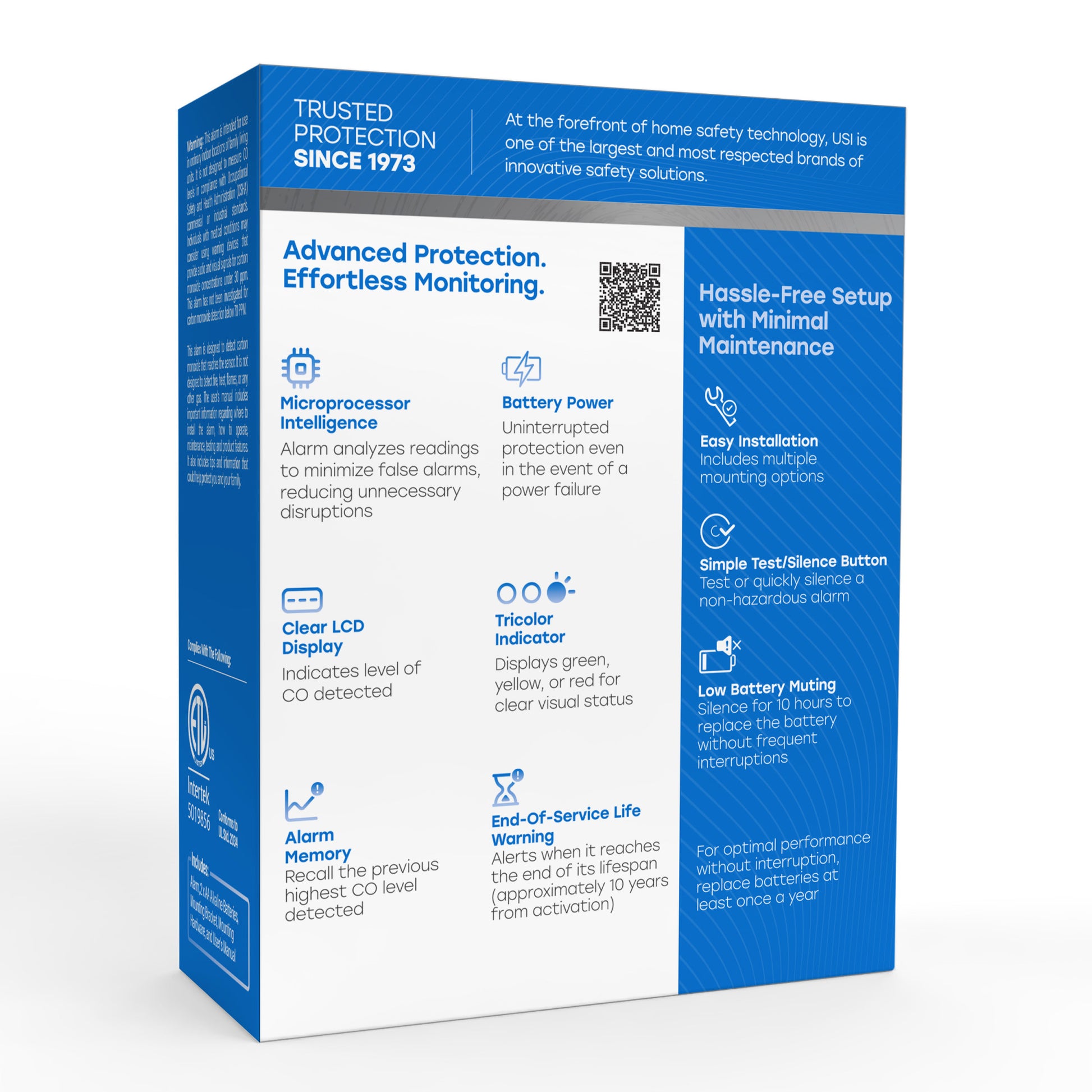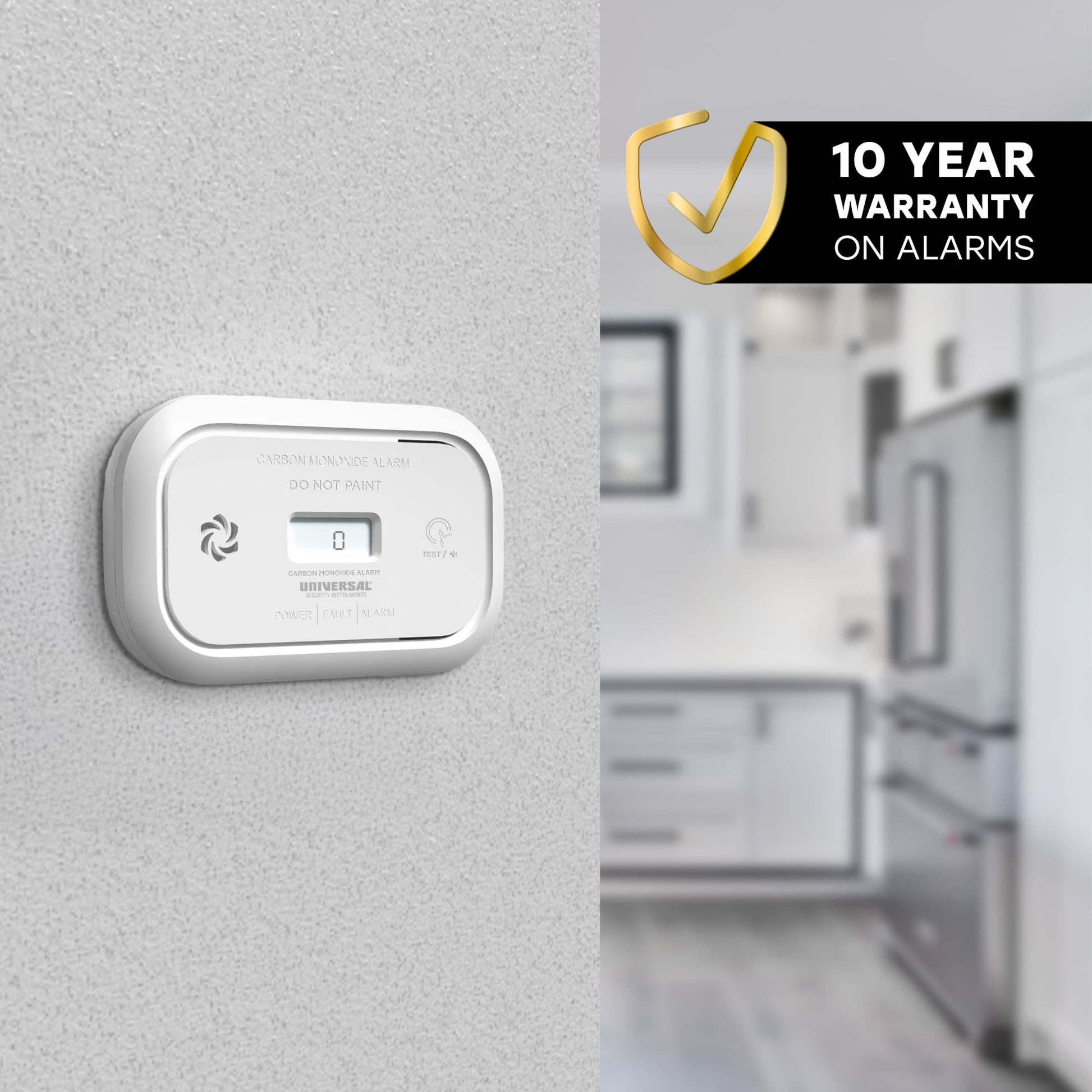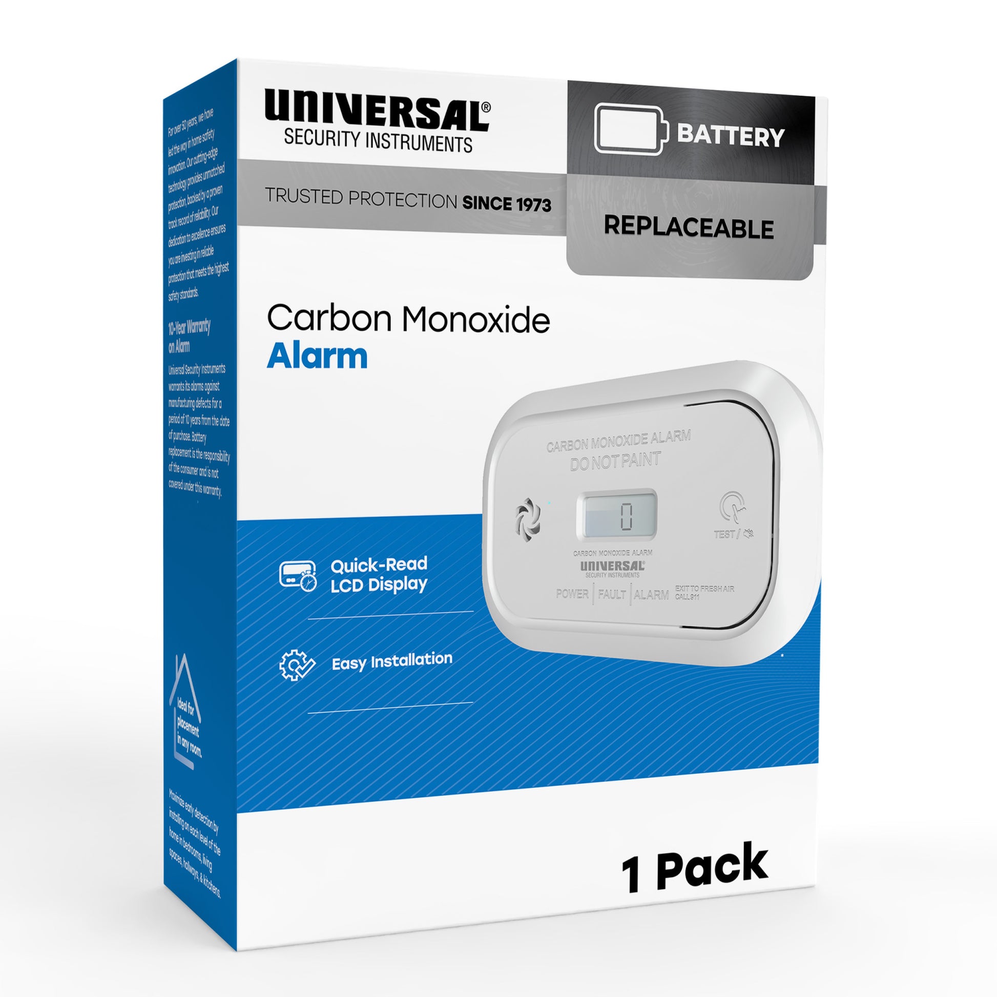 The USI Carbon Monoxide Alarm is your home's silent guardian, providing reliable protection against the invisible threat of CO gas. This advanced alarm features a clear LCD display for easy monitoring of CO levels. A loud, piercing alarm alerts you to dangerous CO concentrations, while a tricolor indicator visually indicates the alarm status. Powered by (2) replaceable AA batteries, the USI Carbon Monoxide Alarm offers uninterrupted protection. Easy to install and maintain, it includes multiple mounting options for flexible placement and a simple test/silence button for convenience. For optimal protection, install the USI Carbon Monoxide Alarm on each level of your home, including bedrooms, living areas, hallways, and kitchens. Backed by a 10-year warranty for added peace of mind, the USI Carbon Monoxide Alarm is a reliable investment in your family's safety. Compliant with UL Std. 2034 4th Edition, this alarm meets the highest industry standards for carbon monoxide detection. Protect your home and loved ones with this essential safety device and enjoy the peace of mind that comes with knowing you're prepared for any situation.
